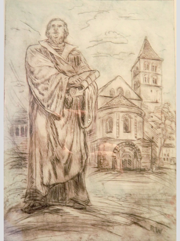 Luther vor der Stiftskirche (Colorierte Radierung von Renate Wandel, Rotation 31, Bad Hersfeld)