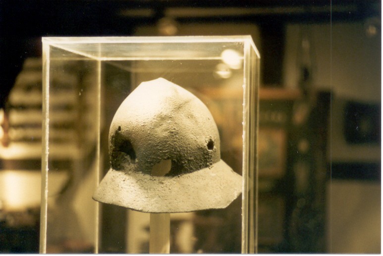 Seine durchbohrte Haube hängte man als Siegestrophäe an das Rathaus. (oben links)