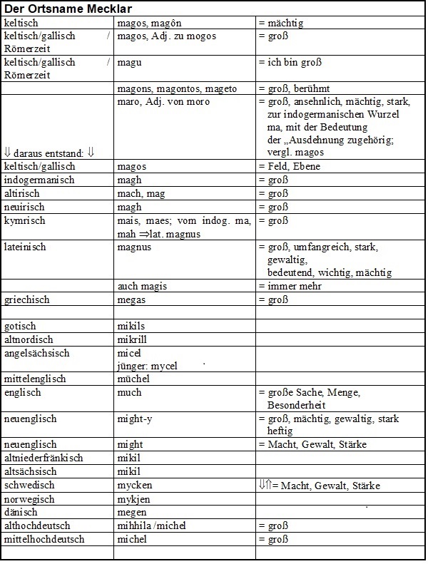 Wie auch die obige etymologische Untersuchung und Darstellung aufzeigt, hat die erste Silbe der beiden Ortsnamen in verschieden alten Sprachen jeweils die Bedeutung „groß“. Wie bereits angesprochen, ist letztlich die Silbe „Meck“ bis hin zu mundartlich „magh“ u.ä. jedoch wohl bereits lange vor der Zeit Karls des Großen bereits im Althochdeutschen und Mittelhochdeutschen durch das Wort 'grôz' = 'groß' ersetzt (Etym.W., Kluge, Berlin 1975).