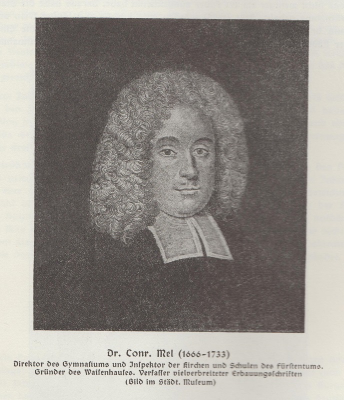 1727 Dr. Konrad Mel führte den Kartoffelanbau ein. Mel war von dem fortschrittlichen Gedanken gefesselt, dass auch weniger gute Schüler eine gute Ausbildung an einem Realgymnasium erhalten sollten.
